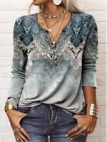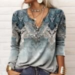Make the most of any day wearing this blue-gray luxe printed top, featuring ornate oceanic swirls with pops of different cool colors. The long sleeves and v-neck with buttons on the front and waist-length fit make it perfect for layering with a cami underneath or blazer/jacket. Wash in gentle or delicate cycle with light colors. Keep away from dark colors.
