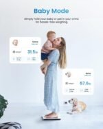 - 13 essential body measurements. The scale shows body weight only. Other body index data are stored in the app, including weight, BMI, and body fat percentage. You can weigh yourself anytime without your phone, and all the data will be uploaded to your App whenever you open the App and measure again. 13 body measurements show on App. Only Weight and BMI are shown on App for underage.