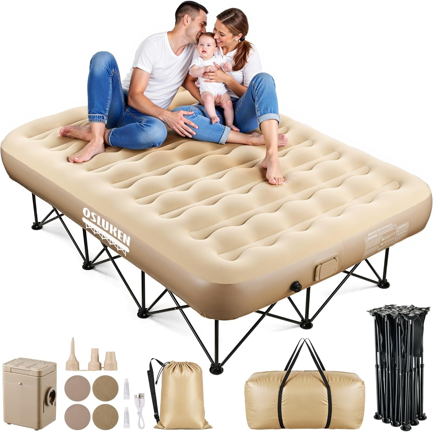 | Included Components | Air Mattress(Queen)*1, Folding Frame*1, Built-in Air Pump*1, USB-C Charging Cable*1, Air Nozzle Kit*1, Frame Carry Bag*1, Mattress Carry Bag*1, Repair Kit*1Air Mattress(Twin)*1, Folding Frame*1, Built-in Air Pump*1, USB-C Charging Cable*1, Air Nozzle Kit*1, Frame Carry Bag*1, Mattress Carry Bag*1, Repair Kit*1 |